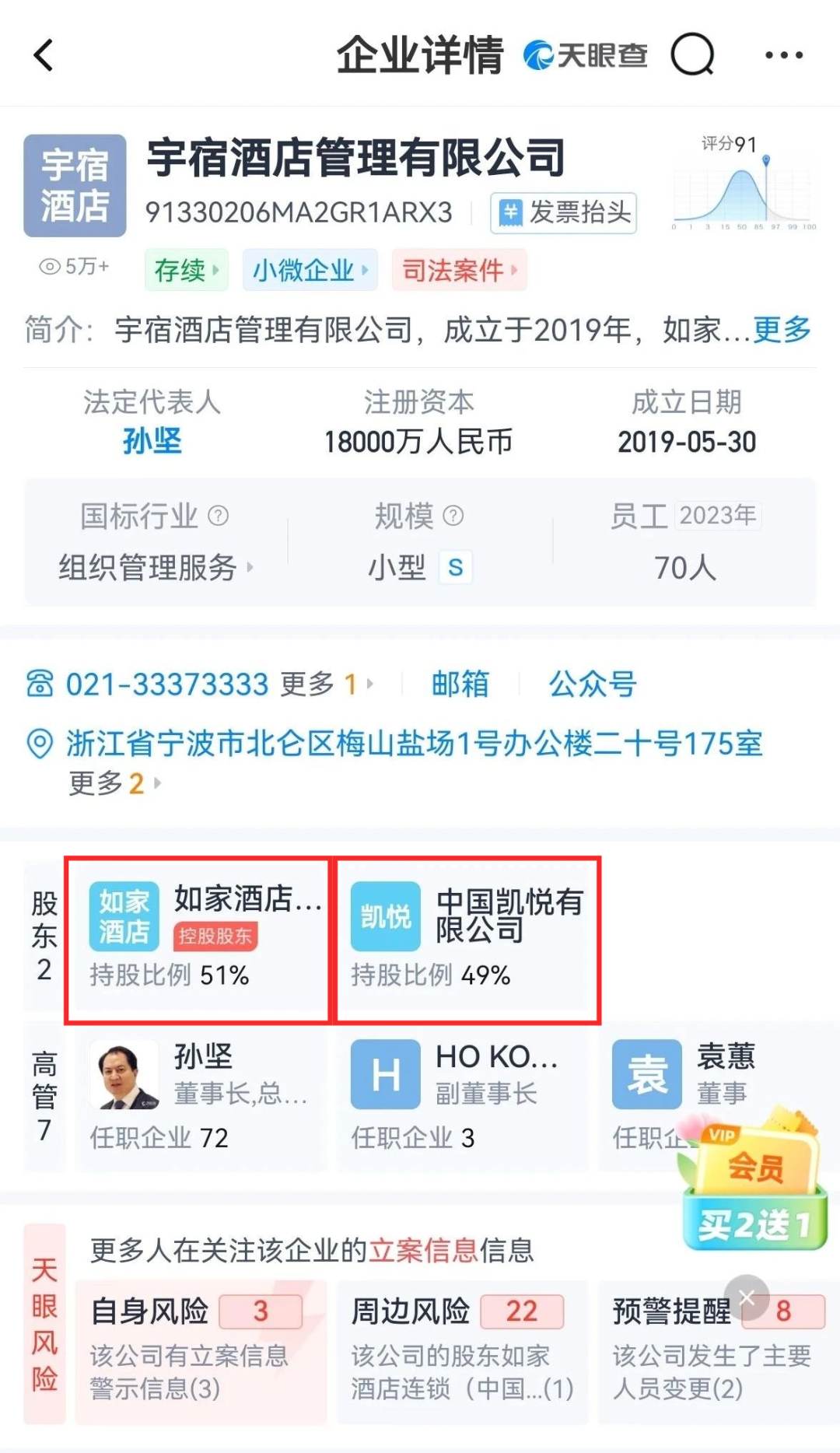 要知道,逸扉酒店的酒馆公司是宇宿酒店管理有限公司,法定代表人是孙坚,大股东是如家酒店连锁(中国)有限公司,持股比例51%。