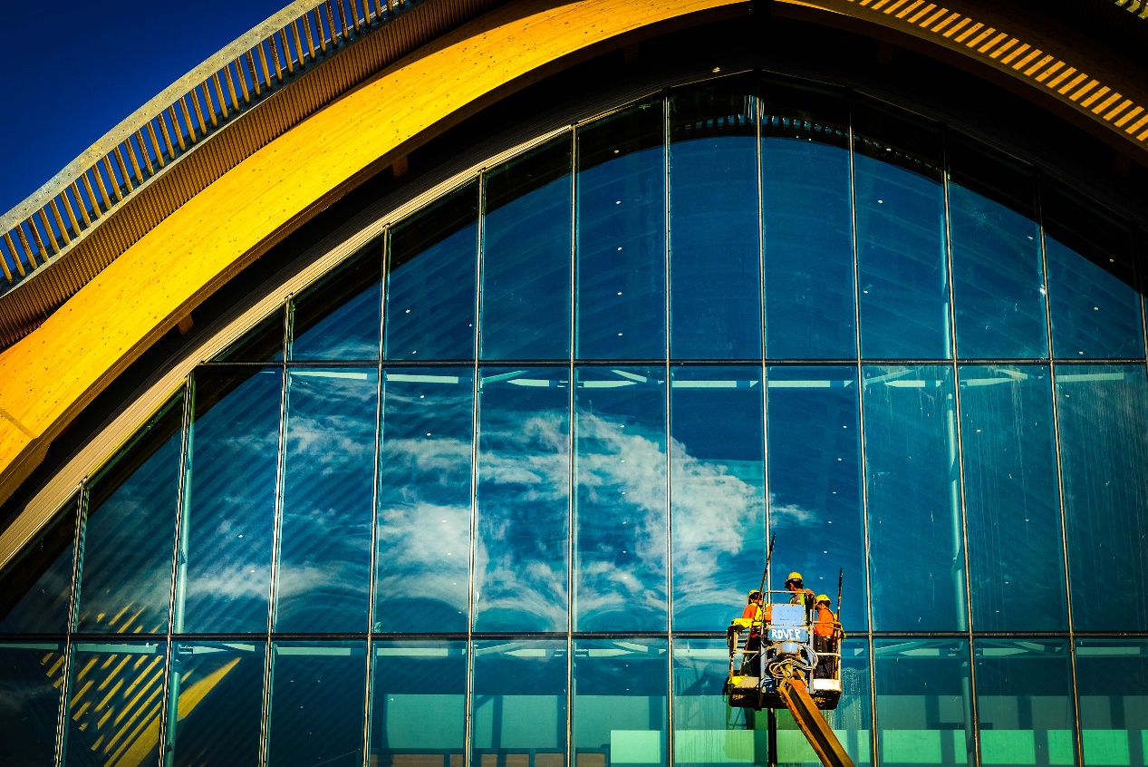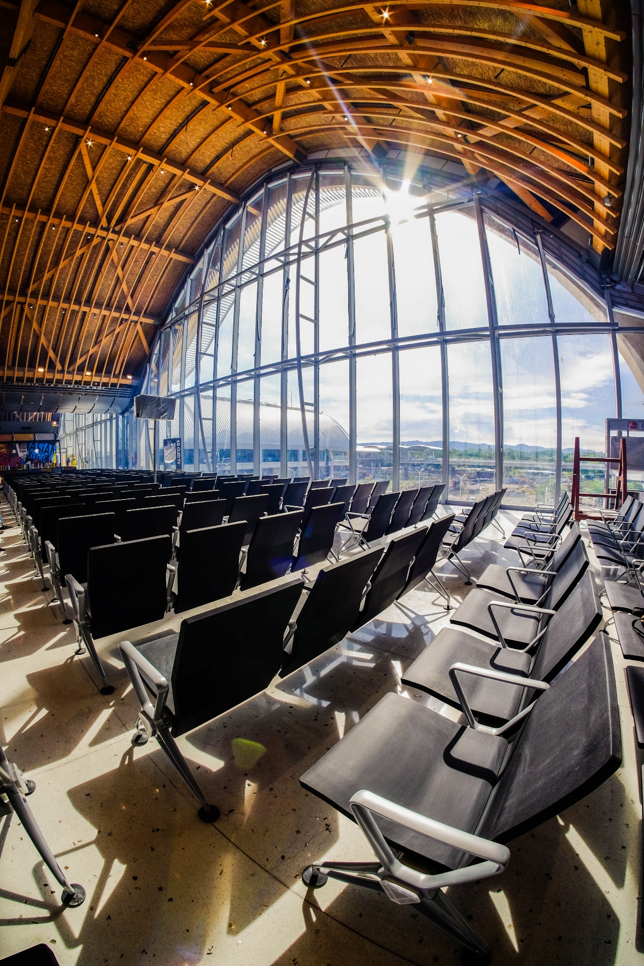 航站楼设计采用30米跨度的胶合木拱构成的波浪形穹顶,呼应着麦克坦岛周边的海洋波纹。15米高的透明玻璃幕墙让空间通透开阔,既减少人工照明依赖,又展现出强烈的生态美学意识。