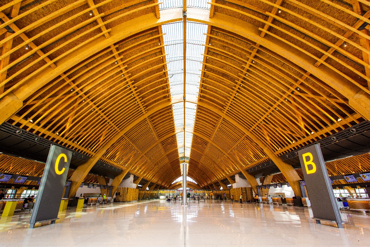 航站楼的被动式节能设计包括高天花板优化热循环、自然采光天窗减少照明能耗、东西向低檐遮阳降低空调负荷,既节能又营造出度假般的舒适氛围。