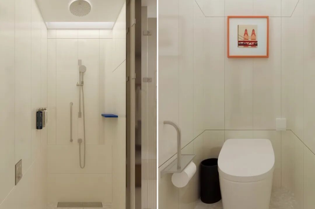 这样的细节还包括,浴室里分开设计的花洒和水阀开关,不用担心洗澡时被淋一身冷水;沙发上配备的USB和type-c三插口充电插孔,可以不用挪窝远离电量焦虑,以及卫生间增设的扶手,防止久蹲或者行动不便的客人起身摔倒……
