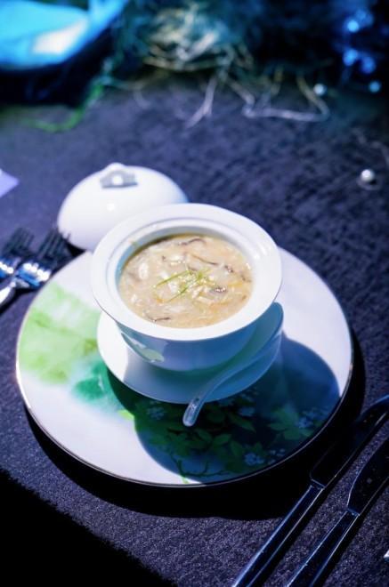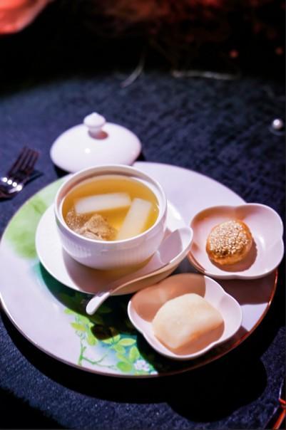 黎敏刚(上海西岸美高梅酒店 中餐行政总厨)将杭州风物与顺德技艺融于一盏,创作「雾锁千湖拆锦羹」。选取千岛湖深水胖鱼头,以古法“生拆”呈现鱼肉的柔嫩与纯净,再以山泉为底,轻佐蔬材提味。入口鲜润细腻,鱼脑绵滑与汤汁醇厚交织,柔中见丰,余韵回甘。
