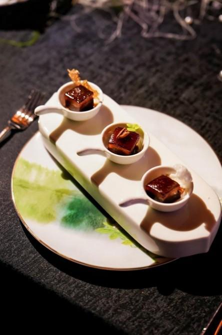 一方山川,三处心迹。李涛(上海苏宁宝丽嘉酒店 中餐行政总厨)以“时令为纲、匠心为本”的烹饪哲学为念,创作「三味东坡肉」,灵感起于三地风物——眉州麻辣热烈、杭州烟笋清雅、儋州黄皮微酸。三碟并列,三味自成:如东坡一生的境遇与心绪——由浓至淡,由喧入静。李师傅以诗的方式烹调肉香,把文人的旷达与趣味,一并留在舌尖。