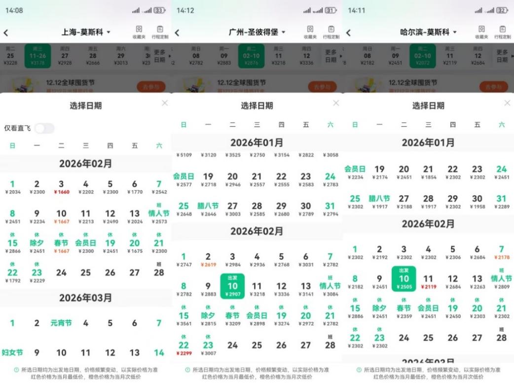 同程旅行平台上,正在推出旅游冰雪季特惠,最高可领取600元东北红包、1500元欧洲红包等。俄罗斯、挪威、芬兰和冰岛都是热门的出境玩雪目的地。“9天7晚圣彼得堡+莫斯科+俄罗斯+谢镇+冬宫+克宫+夏宫花园跟团游”“9天7晚·摩尔曼斯克+莫斯科+圣彼得+萨米村+追光之旅+摩尔曼跟团游”“8天6晚·春节热卖免签俄罗斯莫斯科+尔曼斯克双城4飞8日三次追光体验”都是热门线路,热门团期主要集中在明年1月和2月。相较于其他北欧国家的极光路线,俄罗斯的性价比尤为突出,成本可低至一半甚至以上。