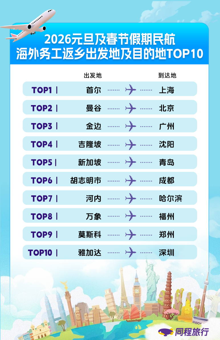近年来,随着中国企业海外投资的增长,在海外务工的国人随之快速增加,元旦及春节前后是他们集中归国探亲的重要节点。同程旅行平台数据显示,海外人员通常在每年的12月中下旬陆续开始预订元旦或春节回国的机票,元旦假期前一周会有一个出行小高峰,今年也不例外。根据同程旅行平台国际机票预订数据,今年元旦及春节假期海外务工返乡的热门出发地主要有首尔、曼谷、金边、吉隆坡、新加坡、胡志明市、河内、万象、莫斯科、雅加达等,整体上主要集中于“一带一路”沿线国家。海外务工人员归国航班的到达地主要集中于上海、北京、广州、沈阳、青岛、成都、哈尔滨、福州、郑州、深圳等城市。