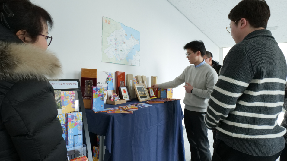 山东文旅代表向现场韩国嘉宾介绍“山东非遗文创展品“(摄影:李好)