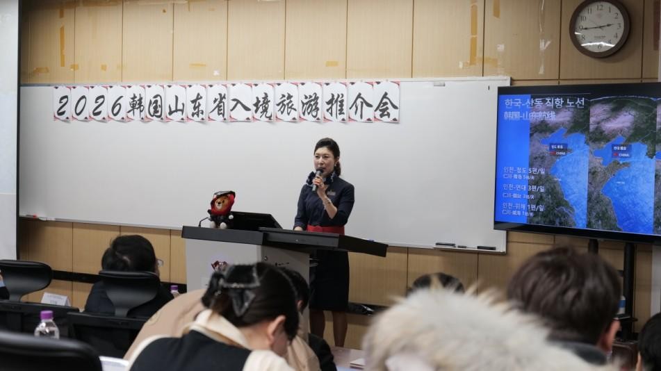 当地时间1月27日下午,山东省文化和旅游厅、国际在线山东频道、中国东方航空、韩国庆熙大学商学院联合举办“韩国·中国山东入境游推介会”,现场通过播放“好客山东”韩语宣传片、举办山东特色非遗文创展、介绍鲁韩姊妹城市间交流活动、展示山东与韩国航司文旅产品、邀请韩国知名博主分享山东旅游体验等多样形式,面向韩国在校大学生与青年群体推介山东丰富的文旅资源和线路产品。