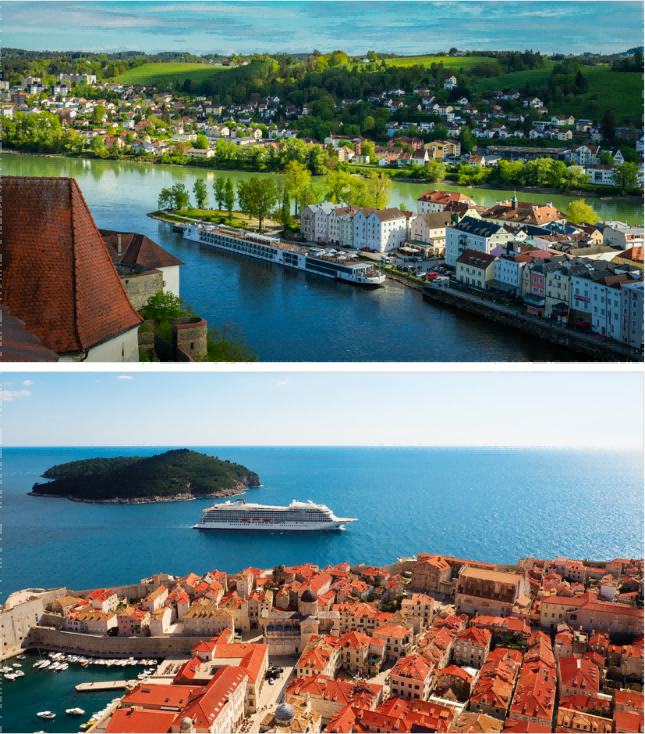 (上:维京长船停靠于德国帕绍;下:维京海轮航行至克罗地亚杜布罗夫尼克)