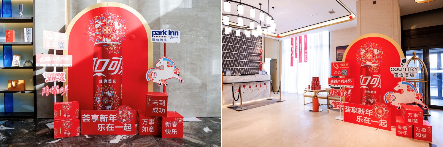 先看看春节期间锦江荟和可口可乐搞的这个联名活动。这俩品牌凑一块儿,思路就很清晰了,一个是让你住得快乐,一个是让你喝得快乐。而快乐这事,得连着来。