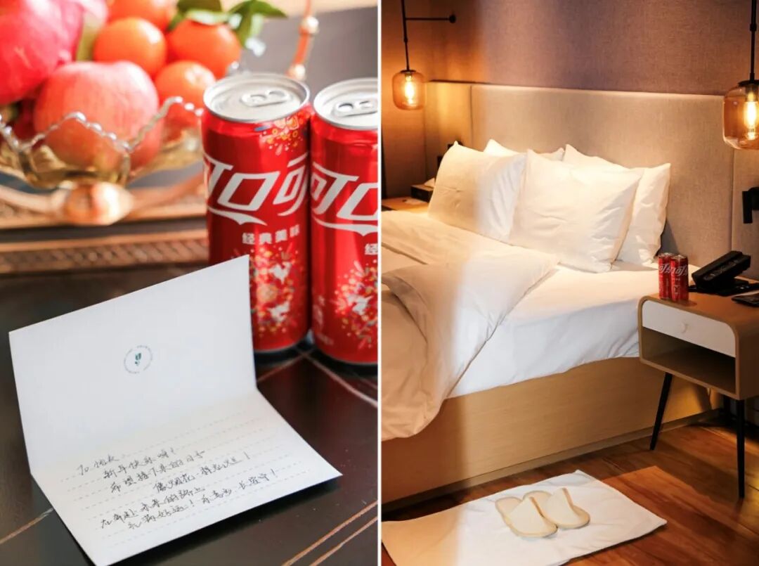 还有客人在社媒分享,春节入住时,前台笑着递过来一瓶定制版可口可乐,瓶身上印着“旅途要畅快,锦江荟常在”,“这种小仪式感不重,但很动人”,有种“在路上被惦记着”的温暖感。