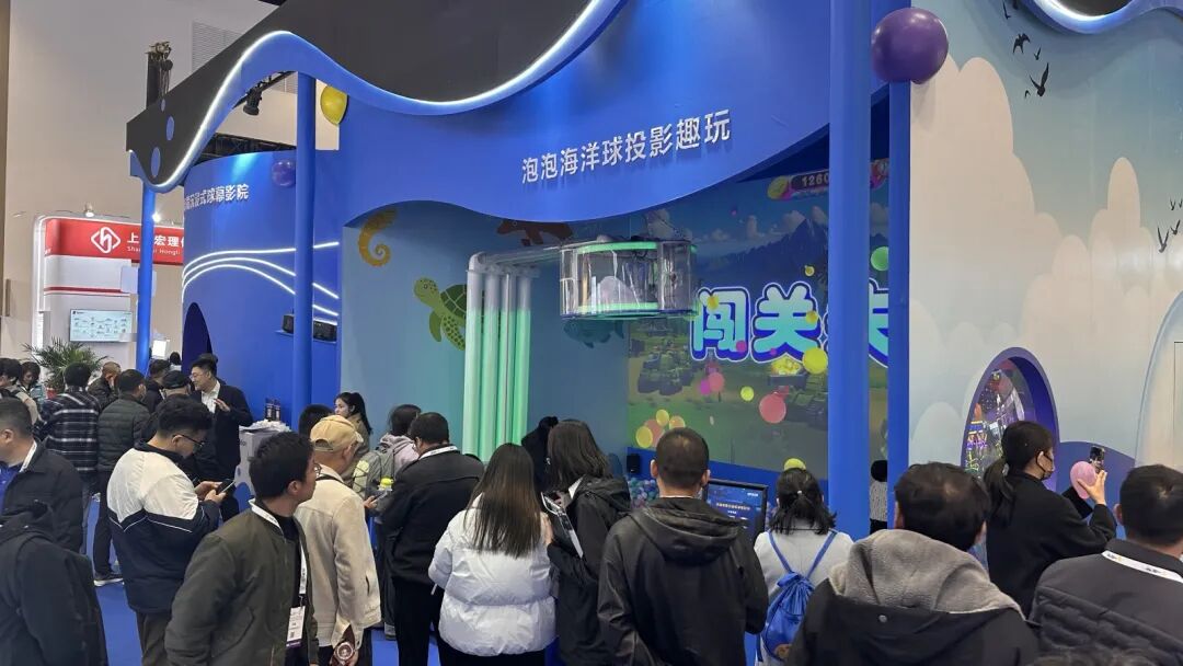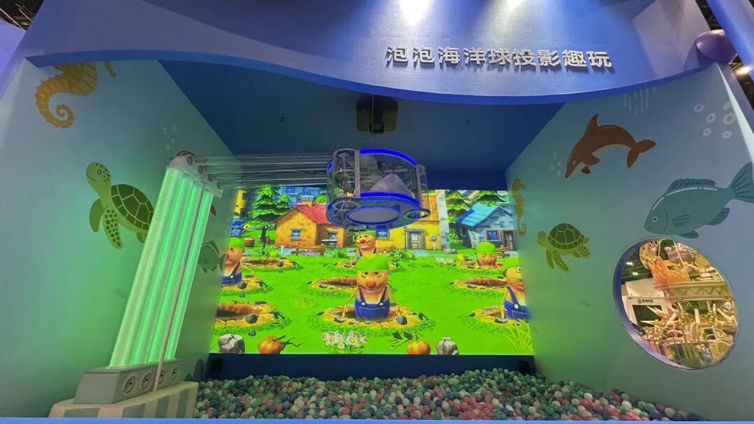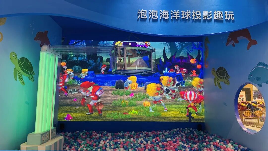 “泡泡海洋球投影趣玩”则凭借趣味十足的强互动体验,成为现场另一大“人气打卡点”。该方案采用1台20000流明*2*3的CB-PU2220B工程投影机搭配ELPLX02S镜头,无需复杂安装,即可实现无接触、强互动的墙面投射,支持“打地鼠”“打僵尸”“坦克大战”等多款卡通互动游戏。借助高速识别技术,设备可精准捕捉海洋球击打位置,命中瞬间即触发炫酷爆破动画、趣味音效与积分反馈,在轻松的游戏氛围中,充分激发参与者的探索欲和创造力,吸引了众多家庭的驻足和参与,现场孩童欢笑声不断。