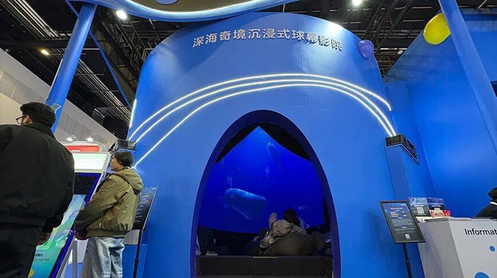 展会现场,爱普生以卓越的光影技术,为多元文旅游乐场景注入全新活力。其中,“深海奇景沉浸式球幕影院”凭借极具冲击力的视觉效果与超强沉浸式体验成为全场焦点。该方案由6台13000流明*1*2的爱普生4K*3高清工程投影机CB-PQ2213B与6只ELPLW05镜头共同呈现。依托爱普生3LCD核心技术的精准色彩表现,结合多机融合、弧面校正与无缝拼接技术,方案实现了360°穹顶覆盖式的沉浸式深海幻境。4K高清分辨率让画面细腻生动,鱼群穿梭、光影流动皆如临其境。现场观众置身其中,仿若潜入蔚蓝深海,开启了一场“人在画中游”的感官奇旅。