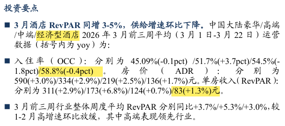 东吴证券2026年3月的报告显示,经济型酒店实际RevPAR 约83元,入住率约58.8%。