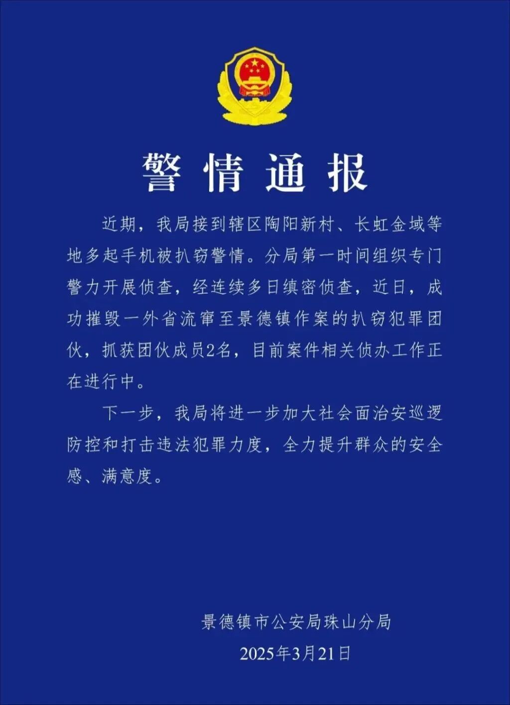 第二天,景德镇警方发布通报,确认摧毁了一个外省流窜扒窃团伙,抓获2名嫌疑人。