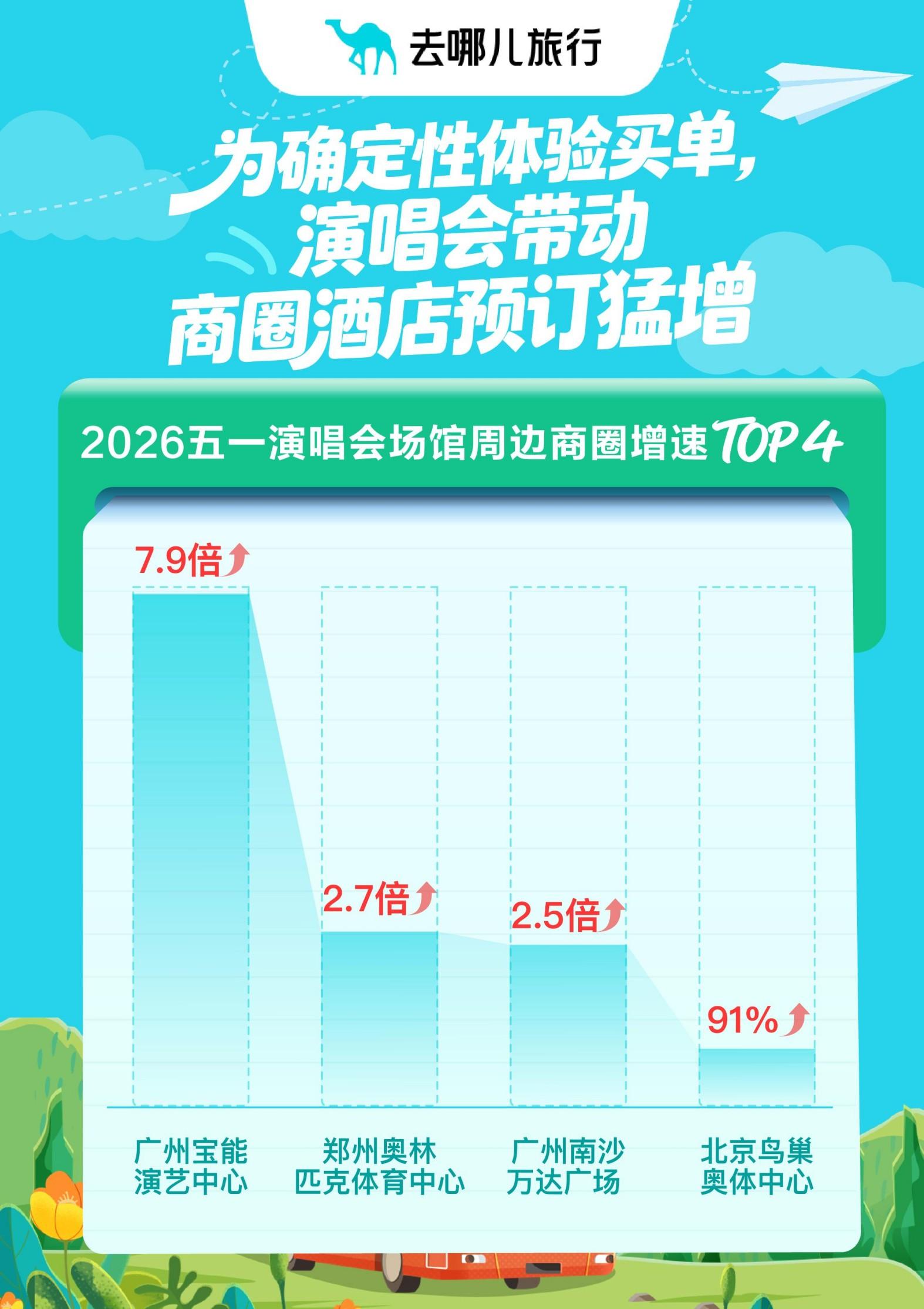 五一的“传统节目”——演唱会、体育赛事和沉浸式市集,将多点开花。去哪儿数据显示,五月天演唱会带动北京鸟巢成为五一酒店预订全国最热门商圈TOP2,预订增幅达到91%;岳云鹏演唱会带动广州宝能演艺中心成为五一全国酒店预订量增7.9倍,是全国增幅最高的商圈;时代少年团在大湾区文化体育中心举办演唱会,不仅带动广州南沙热门商圈酒店预订量同比增长1.8倍以上,也拉动周边中山市酒店预订量同比增长1.6倍;汪苏泷演唱会则带动河南郑州奥林匹克体育中心周边酒店预订量同比增长2.5倍。