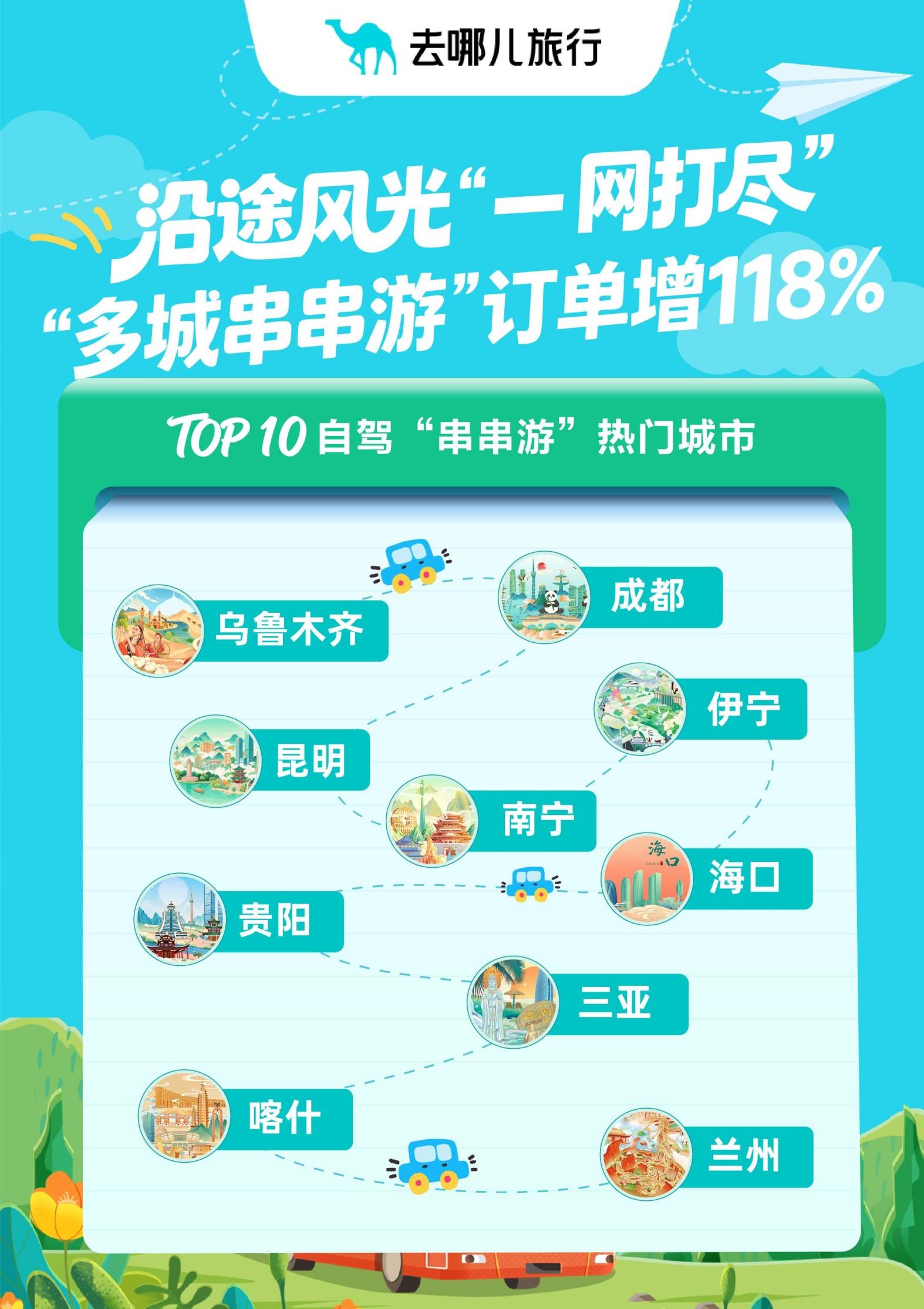 去哪儿旅行数据显示,五一期间预订2个及以上城市酒店的“多城串游”订单量增长118%,国内自驾游预订量同比增长近六成,人均租车天数显著拉长至5天,异地租还车订单量同比增超1倍。TOP10自驾“串串游”热门城市是:乌鲁木齐、成都、昆明、南宁、伊宁、海口、贵阳、三亚、喀什、兰州。