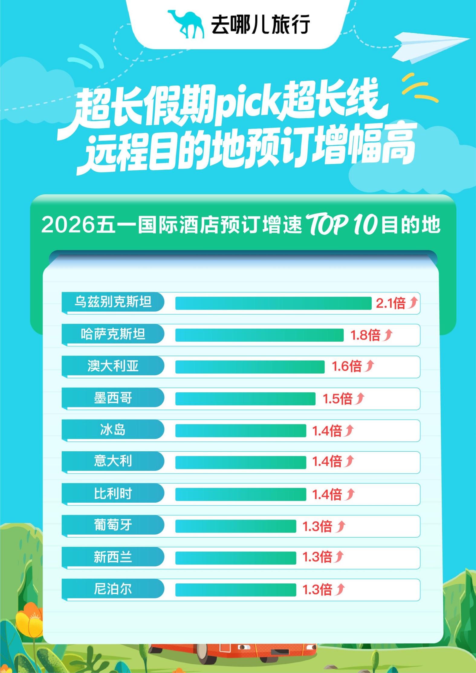 值得一提的,2026年五一的超长假期,叠加东南亚等临近地区国际航班不确定性,让长线出境游增幅最为明显。去哪儿旅行数据显示,增幅最高的20个目的地中,14个是飞行4000公里及以上的中长线目的地,覆盖欧洲、美洲、中亚等远途目的地。