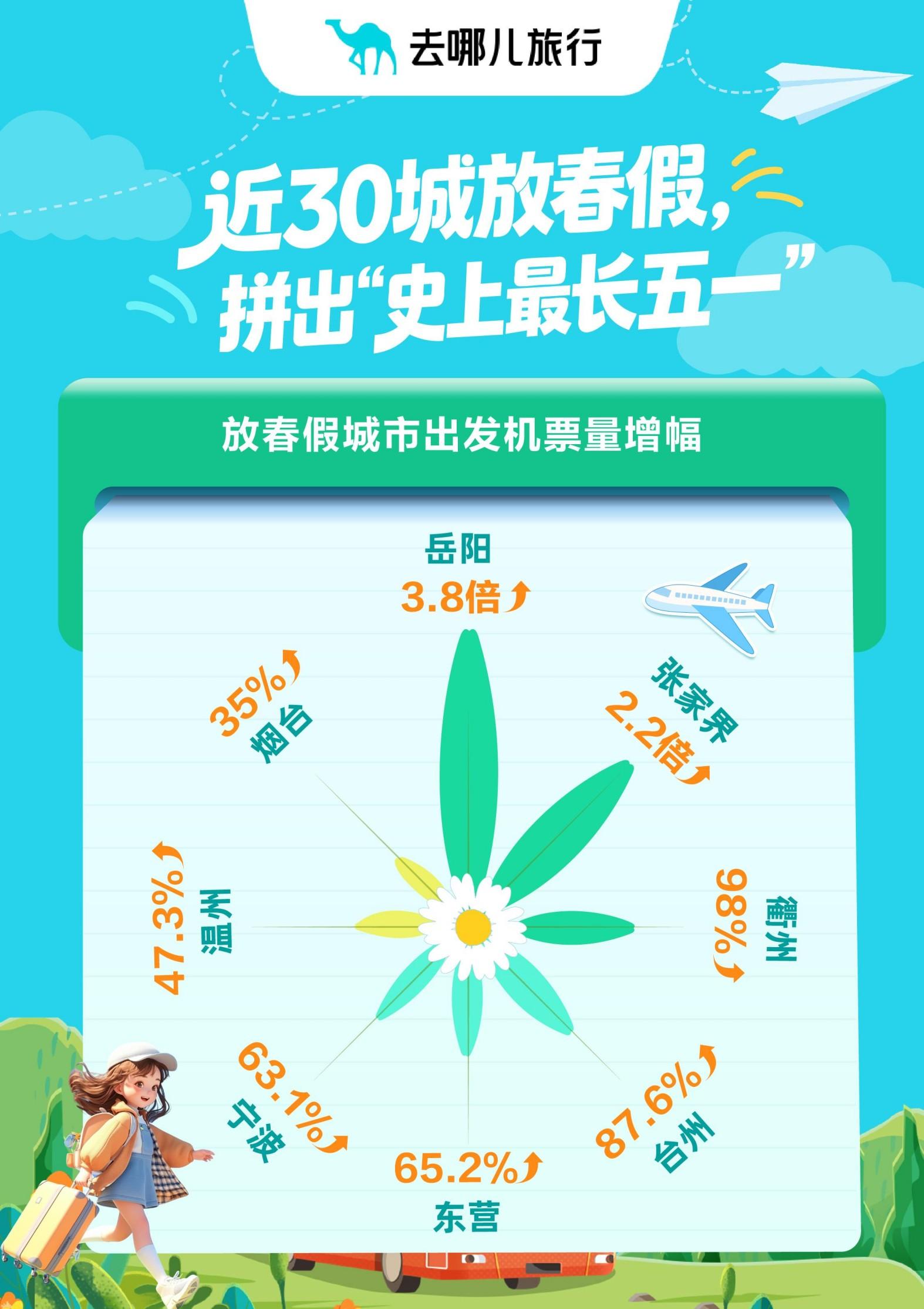 春假明显带动了出游量增长。去哪儿旅行数据显示,杭州、宁波、沈阳、长沙等放春假城市,都位列五一前乘飞机“抢跑”出发热门城市。其中,湖南岳阳、张家界出发的机票预订量同比分别增长3.8倍和2.2倍,浙江衢州、台州均增长1倍左右。多个热门景区春假五一搜索热度数倍增长,截至目前,13-18岁年龄段游客预订景区门票猛增5.6倍。